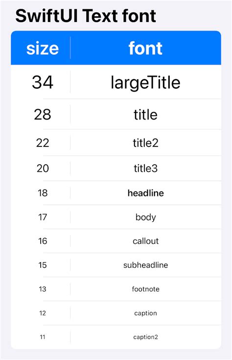 Swiftui Font Sizes. If the text style size doesn't match what your need, you can set a font size by. Web create a custom font with the given name and size that scales relative to the given textstyle.